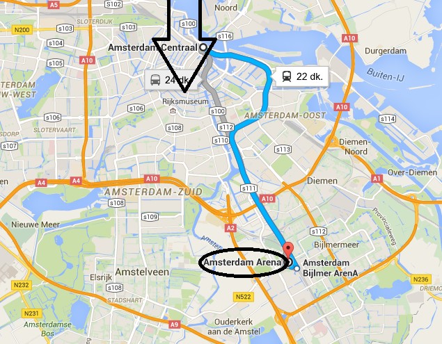 Metro ile (Direkt) : Amsterdam Centraal istasyonundan binip , direkt olarak Amsterdam Biljmer Arena istasyonunda inebilirsiniz. Bu istasyondan yaklaşık 7 dakika yürüyerek Amsterdam Arena’ya ulaşılabiliyor. Amsterdam şehri, ulaşım ağı bakımından Avrupa’nın en zengin şehirlerinden biridir. Dolayısı ile hemen hemen her istasyondan -aktarmalı da olsa -istediğiniz noktalara ulaşabilirsiniz.